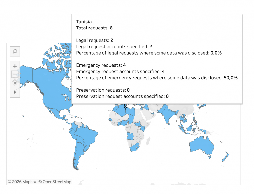 Dans ce cadre, la Tunisie apparaît avec un volume particulièrement limité : 6 demandes gouvernementales au total sur six mois.