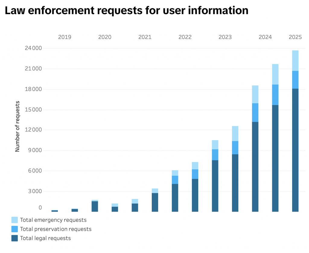 Le volume total de requêtes adressées à TikTok est passé de quelques centaines en 2019 à près de 24 000 demandes en 2025, en incluant les demandes légales, d’urgence et de conservation.