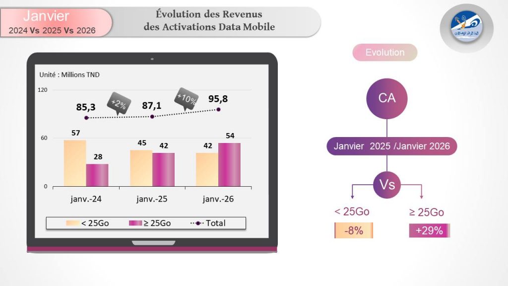 Selon les dernières données publiées par le Instance Nationale des Télécommunications, les revenus des activations data mobile atteignent 95,8 millions de dinars en janvier 2026, contre 87,1 millions en 2025 et 85,3 millions en 2024. Une progression annuelle de +10%, après une quasi-stagnation entre 2024 et 2025 (+2%).
