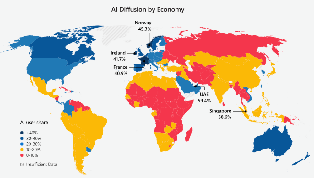 L’intelligence artificielle s’impose comme la technologie à diffusion la plus rapide de l’histoire moderne. Mais derrière l’enthousiasme mondial, la réalité est plus contrastée. Tous les pays n’avancent pas au même rythme, et surtout, tous ne bénéficient pas des mêmes conditions structurelles pour tirer parti de l’IA. C’est ce que met en lumière le rapport “AI Diffusion Report: Where AI is most used, developed, and built”, publié en novembre 2025 par le Microsoft AI Economy Institute.