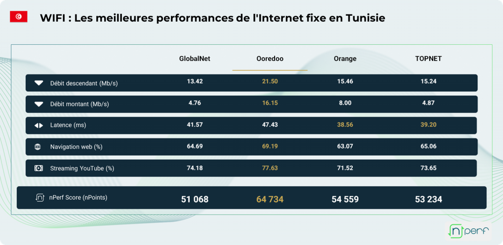 Ooredoo s’impose en tête avec un score de 69 220 nPoints, devançant Orange de près de 5 000 points. Avec des débits de 27,7 Mbps en download et 21,7 Mbps en upload, l’opérateur affiche une forte progression de 24,2% en un an. Leader en navigation web (68,4%) et streaming vidéo (77,1%), il assure une expérience utilisateur équilibrée sur l’ensemble des usages.