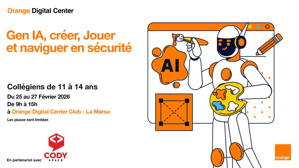 L’Orange Digital Center annonce l’ouverture des inscriptions à une formation dédiée aux collégiens de 11 à 14 ans autour de l’intelligence artificielle. Intitulé « Génération IA, créer, jouer et naviguer en sécurité », le programme se tiendra du 25 au 27 février 2026, de 9h à 15h, au Orange Digital Center Club de La Marsa.