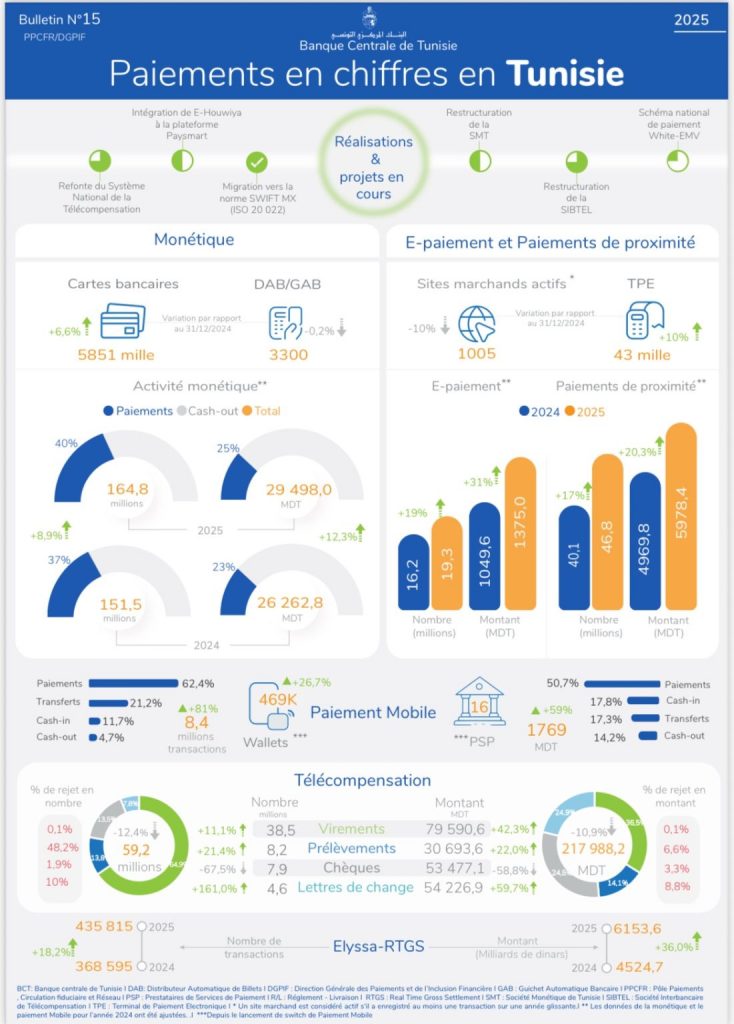 Les paiements de proximité enregistrent également une forte dynamique. Le nombre d’opérations progresse de 401 millions à 468 millions, soit +17%. En montant, les transactions passent de 4 969,8 MDT à 5 978,4 MDT, en hausse de 20,3%.
