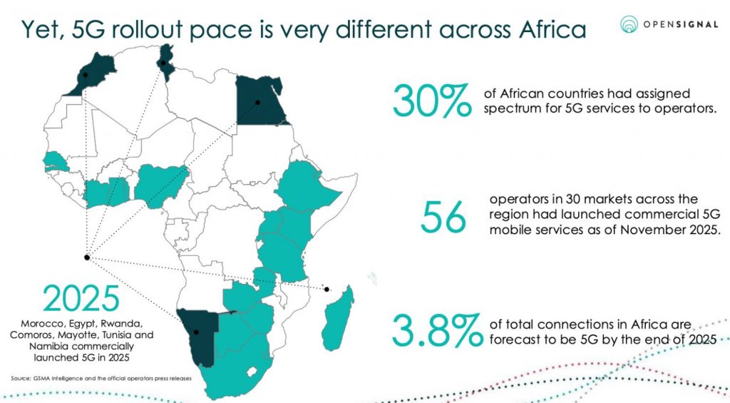 Seuls 30 pour cent des pays africains ont attribué des fréquences 5G aux opérateurs. À fin 2025, 56 opérateurs dans 30 marchés ont lancé des services 5G commerciaux, mais la technologie ne représentera que 3,8 pour cent des connexions mobiles totales sur le continent.