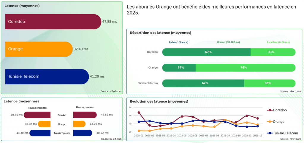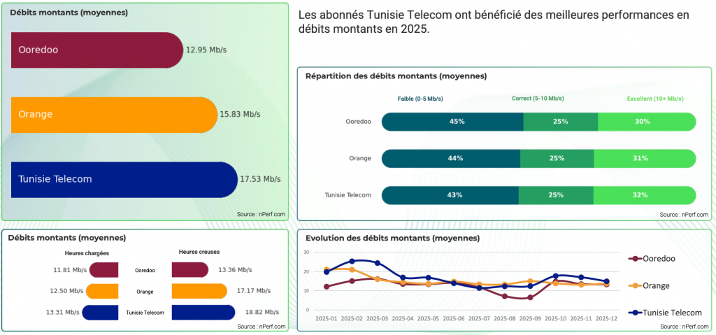 Selon les données collectées entre janvier et décembre 2025 des tests de débits effectués sur l’application nPerf sur Android et iOS, les abonnés tunisiens ont bénéficié d’une amélioration généralisée des usages, que ce soit en débit, en latence ou en qualité de navigation et de streaming